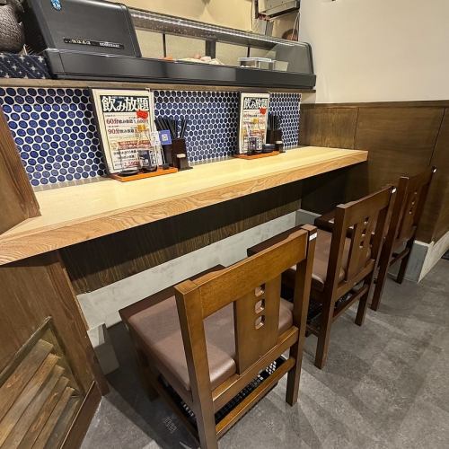 おひとり様で一杯楽しむのに最適なカウンター席もご用意◎横並びで座れるので、デートでのご利用にもおすすめ。その日のネタが目の前にずらりと並ぶ席もあり、料理だけでなくちょっとした会話のつまみにも!